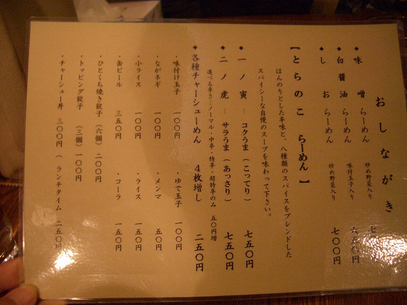 今日は、丸鶏庵の前を通りかかるとスープ切れのため閉店でした。次なる目的地、寅乃虎(住所:札幌市中央区南5条西24丁目3-17第17藤栄ビル1F、TEL:011-561-7955)に行きました。