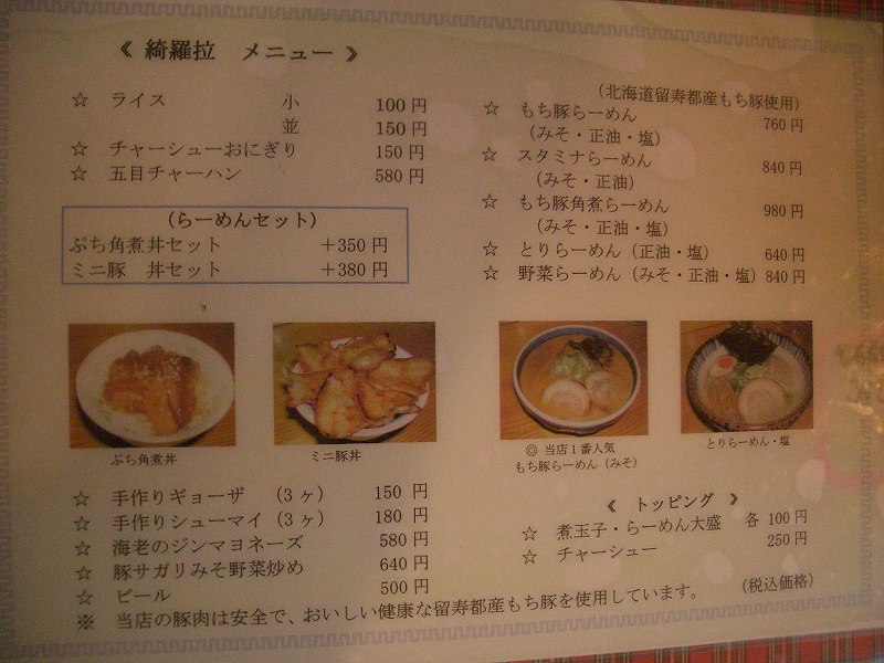 2010年ラーメン食べ始めは、どこにしようかとリサーチしてみるものの、やはり、休んでいる店が多いです。そんな中から、以前、おいしいと聞いていた もち豚専門店 札幌らーめん 綺羅拉 (きらら)(住所:札幌市西区二十四軒4条5丁目9-1、TEL:011-611-3774)に行ってきました。
