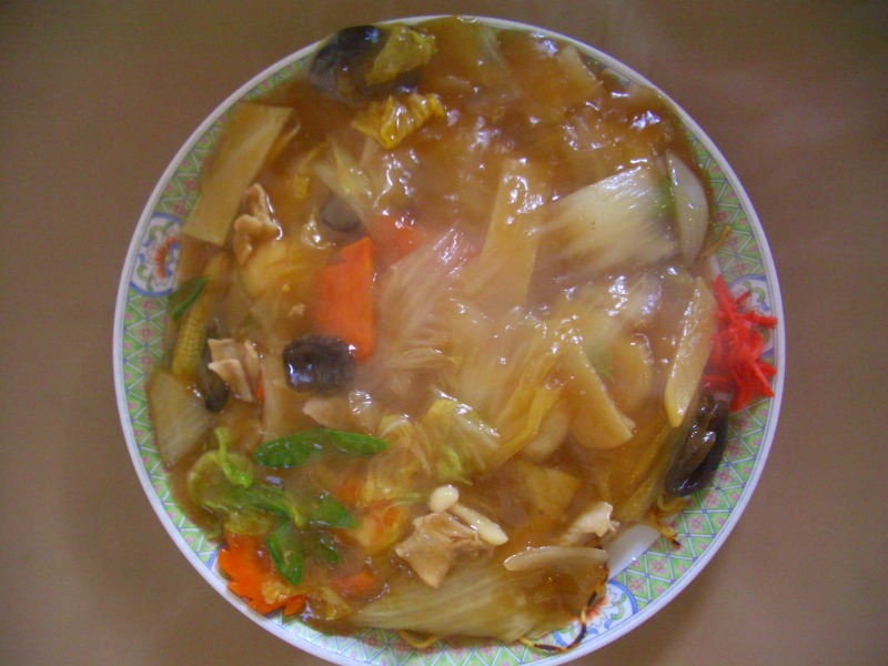 FOODAD「写真で湯気が出ているのがわかりますよね。熱々なんです。ボリュームもあります。具は、豚肉、えび、白菜などの野菜がたくさん入っているし、醤油ベースのあんは濃いめの味つけでおいしいです。麺は、あんに比べすこし少ないような気がしましたが、炒められた麺が所々かりかりの食感になっており、おいしいです。」