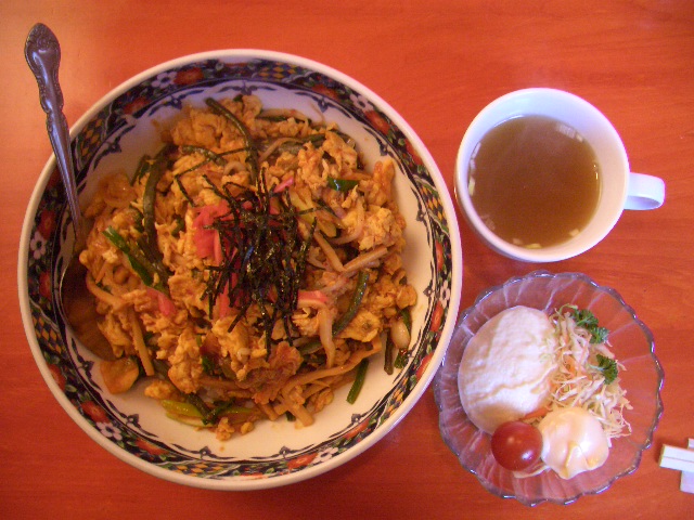 FOODMAM「本当は、朝鮮チラシが食べたいんだけど、DRENに辛いのは食べさせられないので、中華チラシにするわ。朝鮮チラシと似たかんじね。辛くない分とりがらっぽい味が感じられるわ。朝鮮チラシと負けず劣らず、おいしいわ。こっちにも、サラダとスープがついているといいのに。」