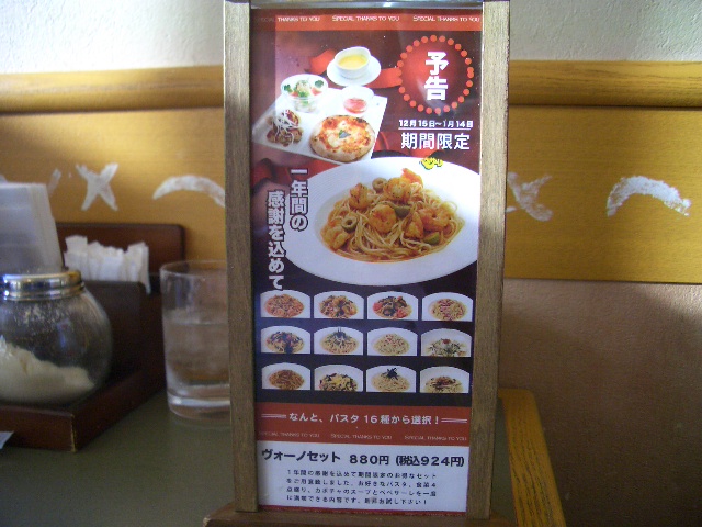 今日の旅は、セールに行く途中に行ったペペサーレ(住所:旭川市花咲町5丁目2272、TEL:0166-59-5788)です。市街地から40号線を走り右にあります。言わずと知れたイタリアン系のファミレスです。今日はMAMのリクエストで期間限定の感謝セットを食べにきました。