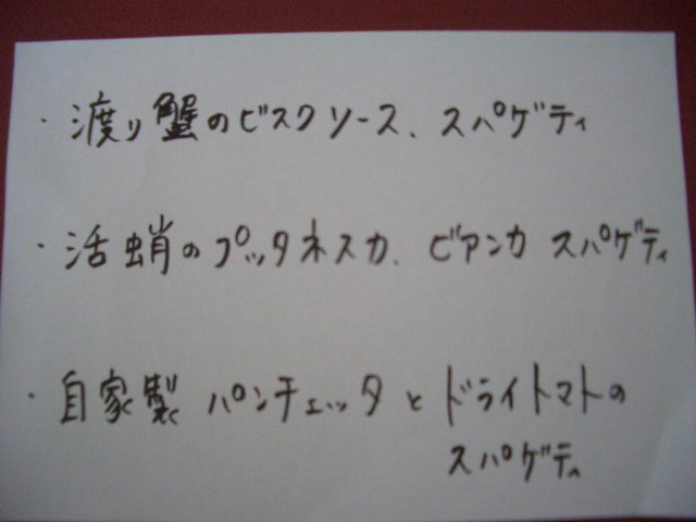 本日のパスタ(活蛸のプッタネスカ、ビアンカスパゲティー)があらわれた。