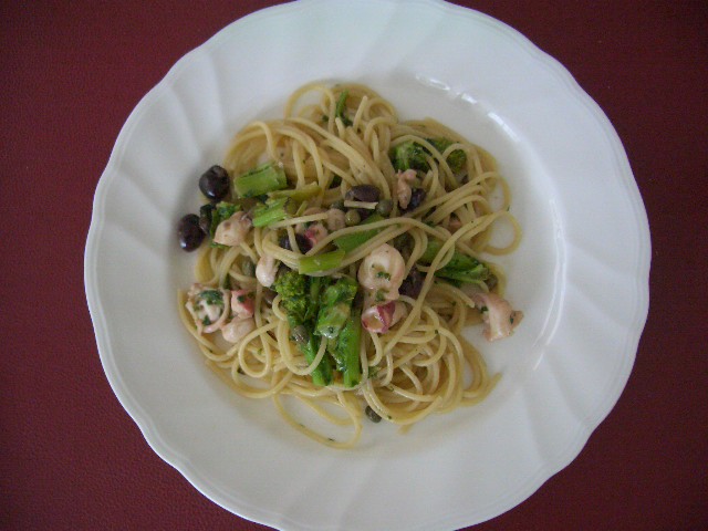 FOODMAM「蛸、オリーブ、ブロッコリー、ケイパーの入ったオイルベースのスパゲッティーね。蛸の味も十分に出てわよ。個人的には、もう少し細いパスタで、ゆで加減がもう少しアルデンテの方がすきね。」