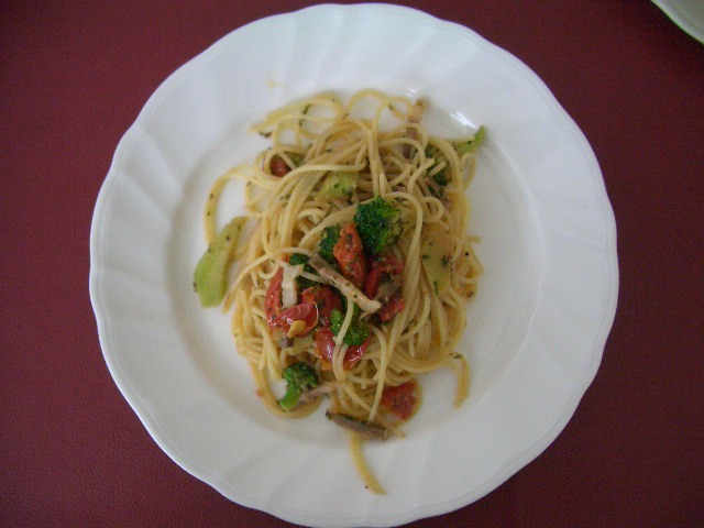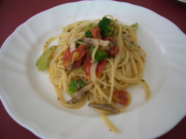 FOODAD「パンチェッタ(塩付け豚)、ブロッコリー、ドライトマトが入ったオイルベースのスパゲッティーです。スパゲッティーが少しゆですぎているのかなという感じがしました。」