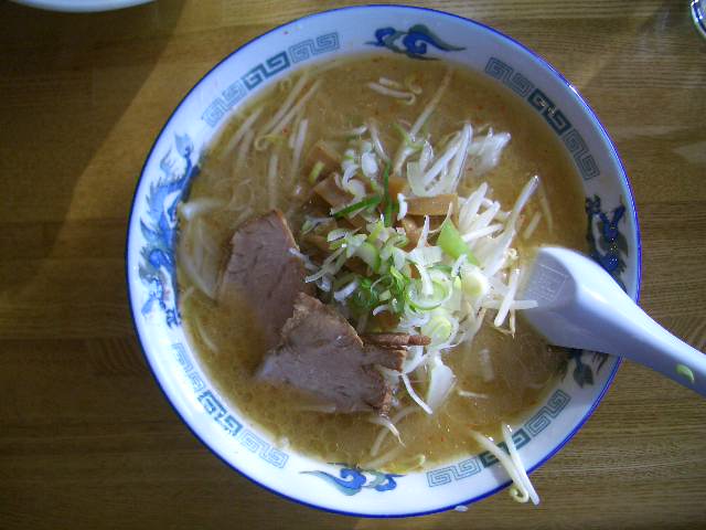 FOODAD「味噌ラーメンは、麺は、中細麺です。具は、もやし、タマネギ、にらです。野菜は、炒め方がうまいのでしょうか、しゃきしゃきの歯ごたえでとてもおいしいです。スープは、一口飲むと「生姜」がきついなという印象でしたが、食べていくと気にならなくなります。スープは、適度にこくがありますが、全部飲み干せるほどおいしいスープです。野菜を炒めるときにバターを使っているのか、スープにその味もうつりいいアクセントになっています。」