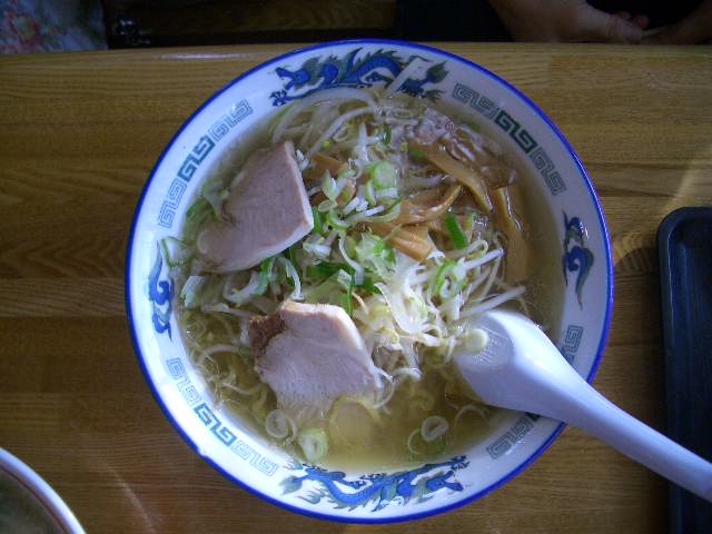 FOORANDMAM(特別出演)「塩ラーメンは、麺は味噌、スープは広東メンと同じね。具は、塩ラーメンには珍しく、もやし、タマネギと豊富に入っているね。それが逆にスープに溶け出し、塩本来のスープの味の邪魔をしているような感じがしたね。ただ、塩ラーメンも岩見沢ではかなりおいしい方だと思うね。」