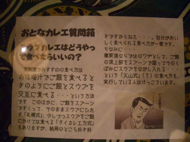 (寝釈迦は、おいしいだけじゃなく、表示もおもしろいです。「おとなカレエ質問箱」を参考にして行ってみてください。ただし、スープカレーじゃなくてスウプカレエですよ。←こういうところも大好きです。)