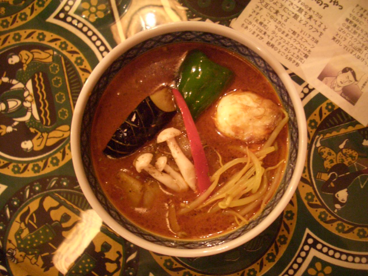 FOODAD「なす、もやし、タマネギ、ピーマン、赤ピーマンなどの野菜は、素揚げしてあり、歯ごたえが残っていて、とてもおいしいです。ゆでたまごはあげているにも関わらず、黄身が半熟でこれもおいしいです。チキンもやわらかいです。具はすべておいしいです。スープは、料はそれほど多くないですが、香辛料が何種類も入っていてスパイシーで濃厚でおいしいです。ただ、とても辛いのでDRENは食べられません。ということで、今日は独りなのでこの店を選びました。」」