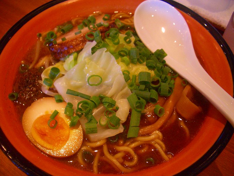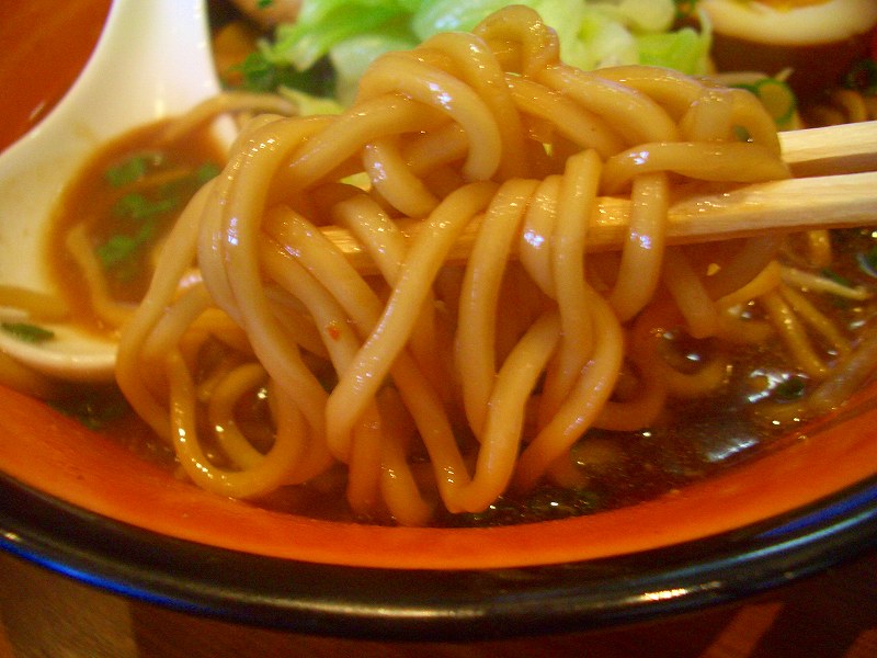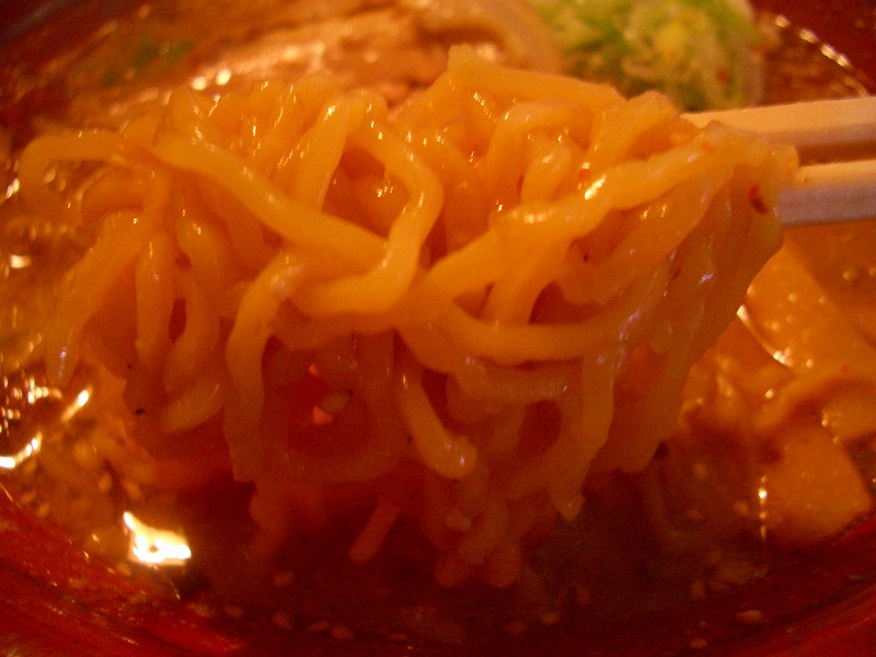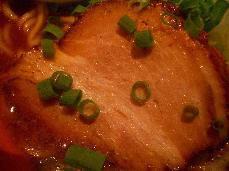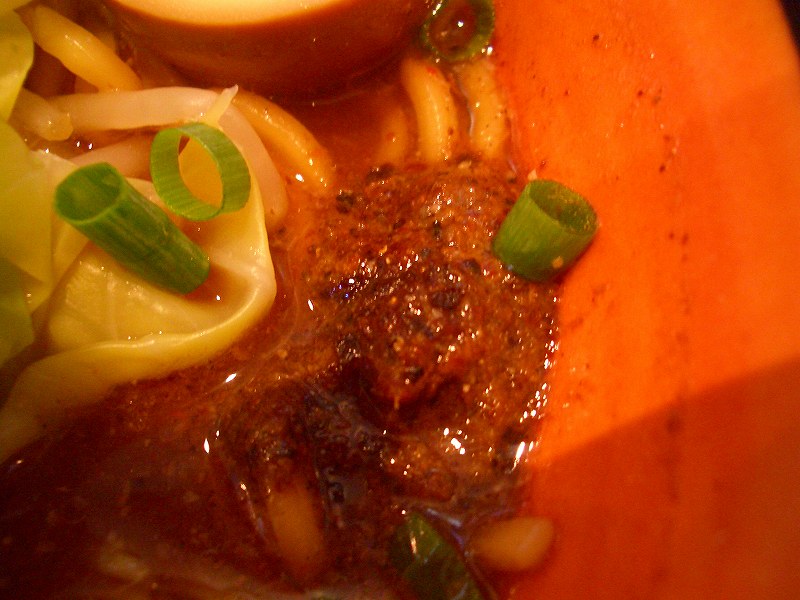 スープの色が赤味噌のような色をしています。一口飲むと、醤油だれの強いスープで、豚骨がそれにまろやかさを加えています。