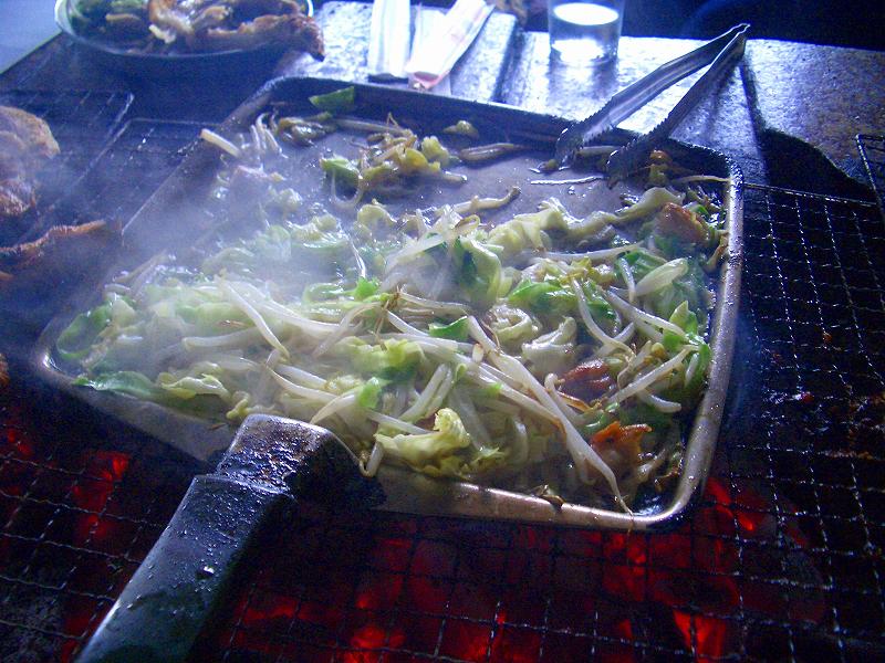 中に入ると、2列にブロック塀でつくられたような焼き台が並んでおり、既に焼き始めているお客さんの煙でもくもくです。
