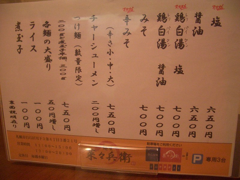 そんな帰り道もやっぱりラーメンです。WEB上で評判の菜々兵衛(住所:札幌市白石区川下3条4丁目3-21、TEL:011-873-8860)に行きました。