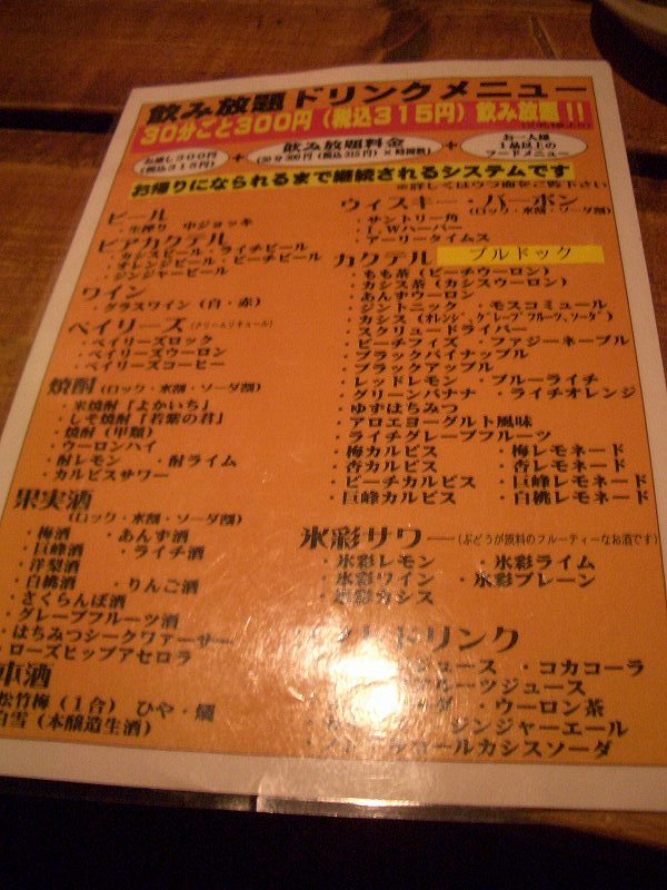 曜日によっては、60分300円飲み放題で、その代わり一人1品を必ず頼むという制度になっています。