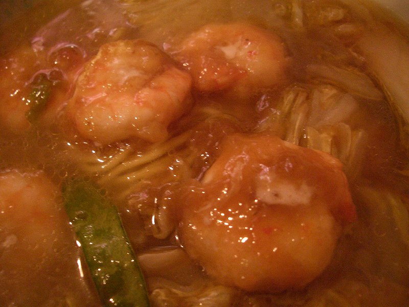 スープは熱々です。濁ったスープは、海老を中心に、魚貝系の味でおいしいスープです。」