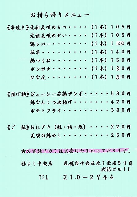 モツ串と言えば、福よし 札幌中央店(住所:札幌市中央区北1条西5丁目 興銀ビル1階、TEL:011-210-2944 )です。またまた、お持ち帰りしました。