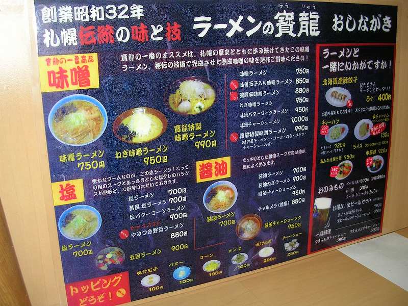 今日は、寶龍(住所:札幌市中央区北5条西3・4丁目アピア内、TEL:011-209-3519)に行きました。すすきのに総本店があり、全道各地にお店がある、超有名店です。