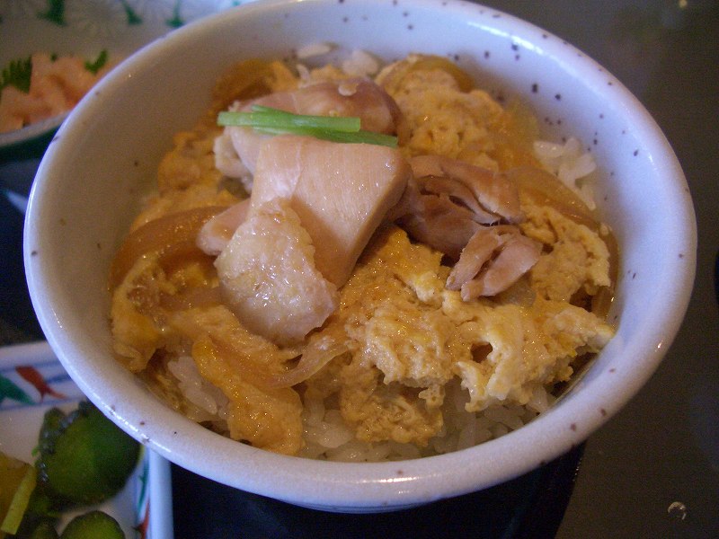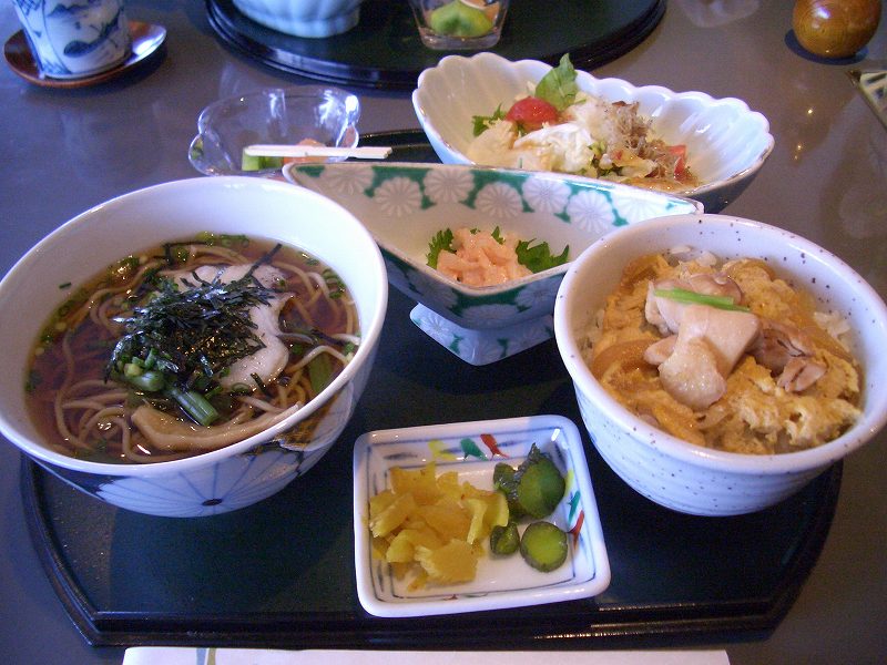 山菜やまかけそば、親子丼、小鉢(いかのたらこあえ)、香の物のセットです。サラダと果物もついていて、ボリュームがあります。」