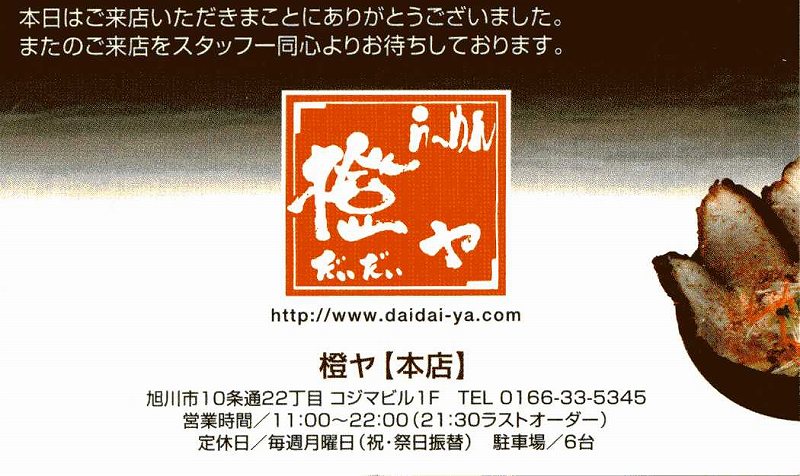 今日は、橙ヤ 本店(住所:旭川市10条通22丁目、TEL:0166-33-5345)に行きました。色んな雑誌にも紹介されている有名店で、我が家も何度が訪れた事があるお店です。