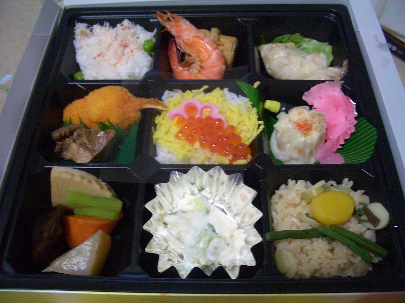 ご飯が左上、真中、右下の3仕切りで、いくらのちらしから栗ご飯までバリエーションが豊かです。おかずが6仕切りで、煮物、シューマイ、サラダなどこちらもバリエーションが豊かです。幕の内弁当でもこんなに沢山の種類のおかずははいっていないです。 味は、パンチのあるものはないですが、上品な味わいでした。」