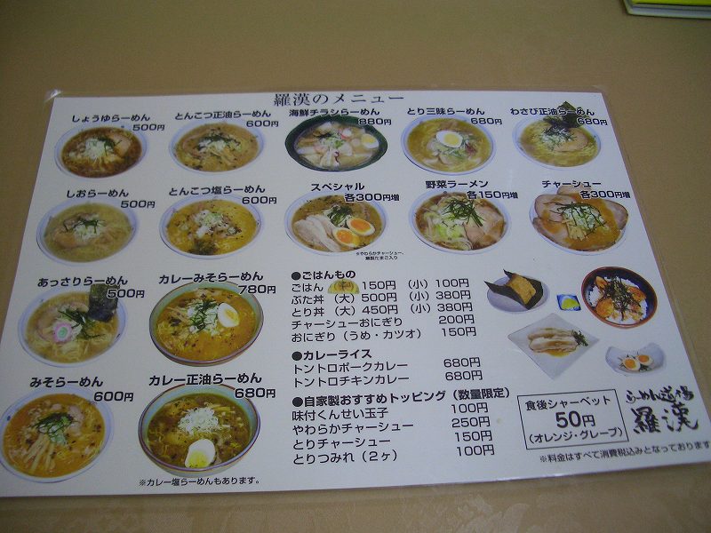 今日は、らーめん道場 羅漢(住所:旭川市緑町23丁目、TEL:0166-53-5858)に行きました。イオンの向かいにあり、気になっていたお店です。イオンに行く機会は結構ありますが、食事は、イオン内のフードコートを利用することが多いので、初めての来店です。