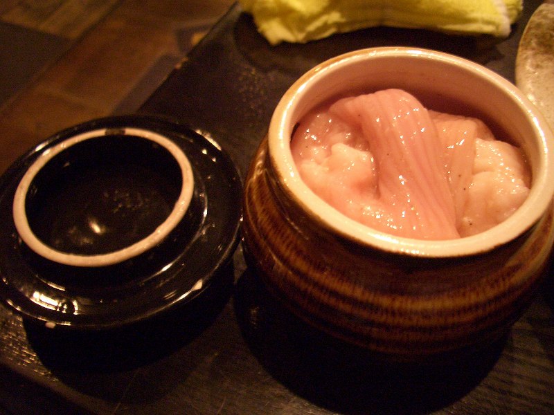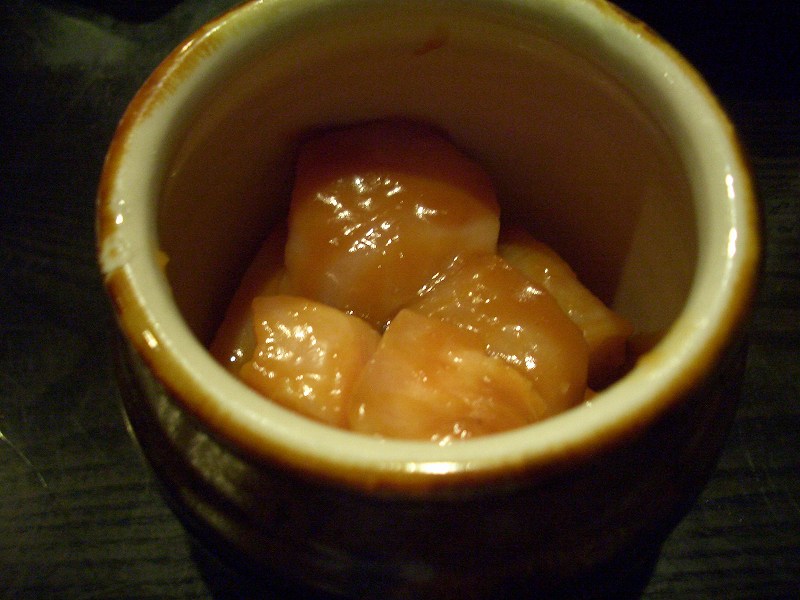 3炎のホルモン 今日、一番おいしかったのがこれです。今までのホルモンのイメージをを覆すホルモンでした。ホルモンの半分に脂身がついており、とてもおいしかったです。ホルモンは壺に入っていてお店のこだわりを感じます。