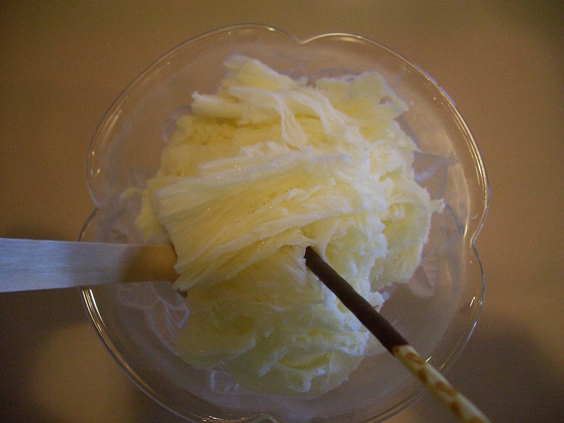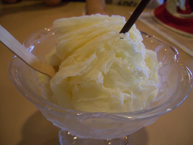 ミルクのアイスクリームをかき氷にしたものです。かき氷よりもきめが細かく淡雪のような食感で、口の中に入れると溶けてしまいます。今まで食べたことのない食感です。