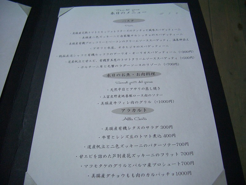 今日は、美瑛町にある八千代牧場に隣接するふれあい牧場で遊んだ後、美瑛町にあるオステリア・バローレ(住所:美瑛町美沢共生、TEL:0166-92-2210)に行きました。ちゃグルさん が紹介していておいしそうだったので訪れることにしました。
