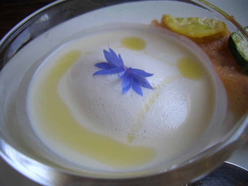 そして、本日のスープは、カリフラワーの冷製ポタージュです。今日は暖かいので冷製スープは嬉しいです。カリフラワーの素材の味もするし、塩味もしっかりしていておいしいです。」