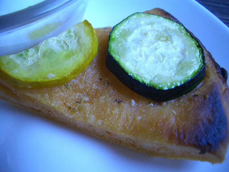 まず、自家製パンです。トマトペーストのフォカッチャと二色のズッキーニです。パンには、トマトの風味がしっかりとついています。ズッキーニはくせがなくおいしいです。