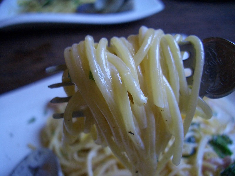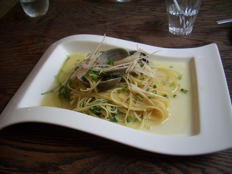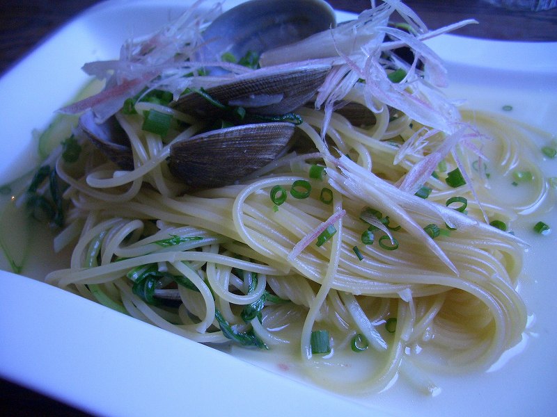アサリと水菜、オカヒジキのスパゲティーニがあらわれた。