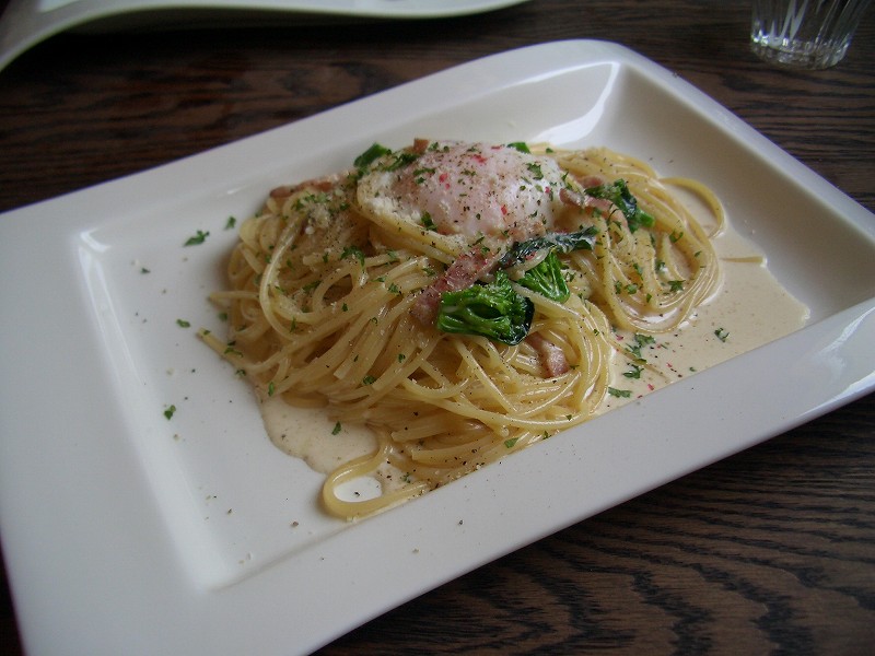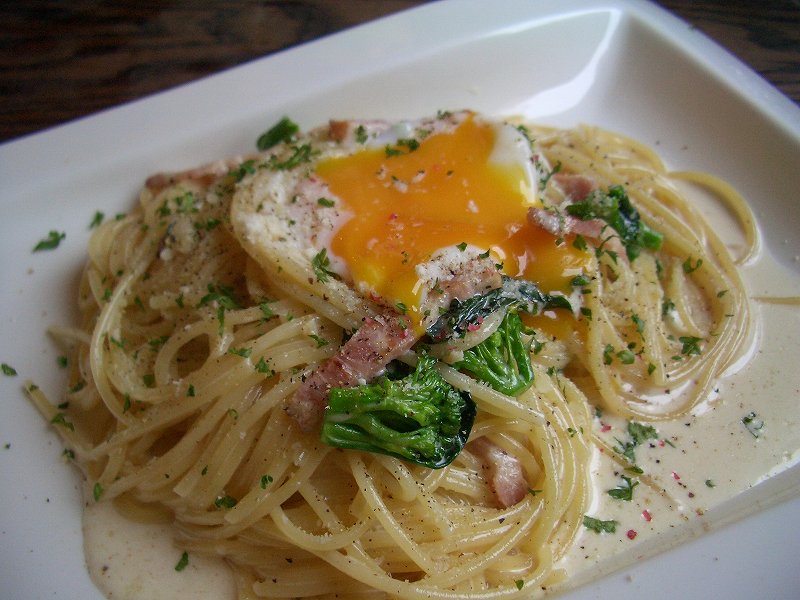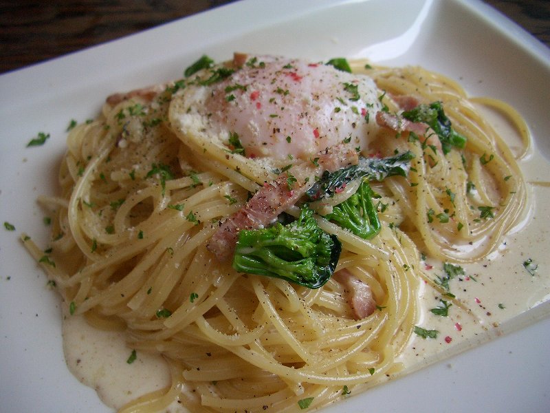 美瑛産有機ブロッコリーとベーコンのクリームソーススパゲティー、温泉卵添えがあらわれた。