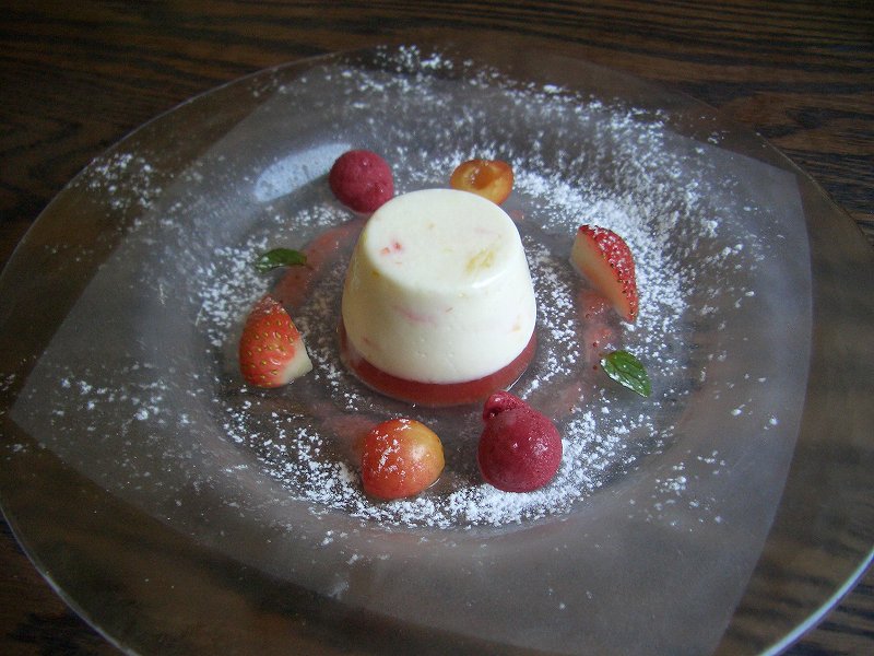 パンナコッタの甘み、フルーツの酸味が絶妙です。ラズベリーのシャーベットは、果実そのものという濃い味で、すっきりします。」