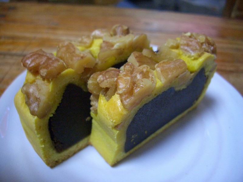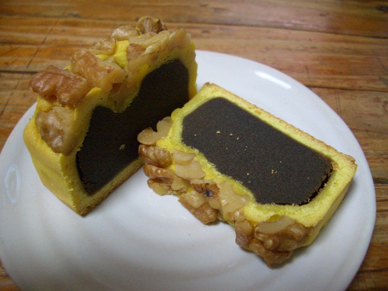 皮の部分は和菓子にあるような堅めの皮でした。餡は、羊羹のような昔っぽい餡で、懐かしい味でした。個性的な皮と餡に大量のくるみが意外とあいました。一切れで満足する味です。