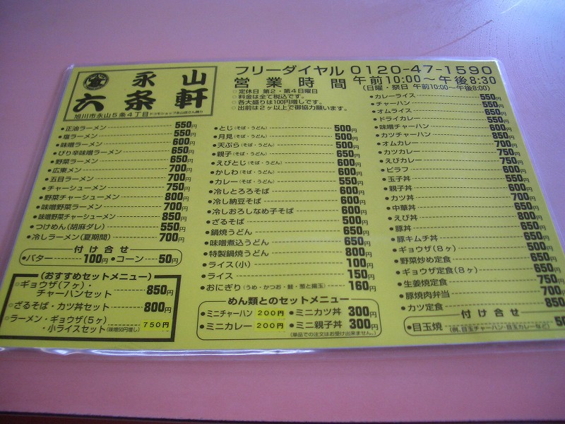 今日の旅は、六条軒(住所:旭川市永山5条4丁目6-5、TEL:0120-47-1590)です。○○軒と聞くとおいしいラーメンが出てきそうな気がするのはDADだけでしょうか。