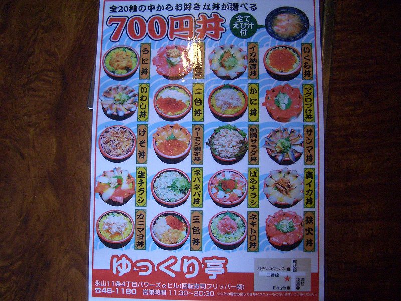 今日の旅は、ゆっくり亭(住所:旭川市永山11条4丁目パワーズαビル、TEL:0166--46-1180)です。20種類の丼があるという記事を見たので訪れてみました。今日は色々な『えっっ』がありました。