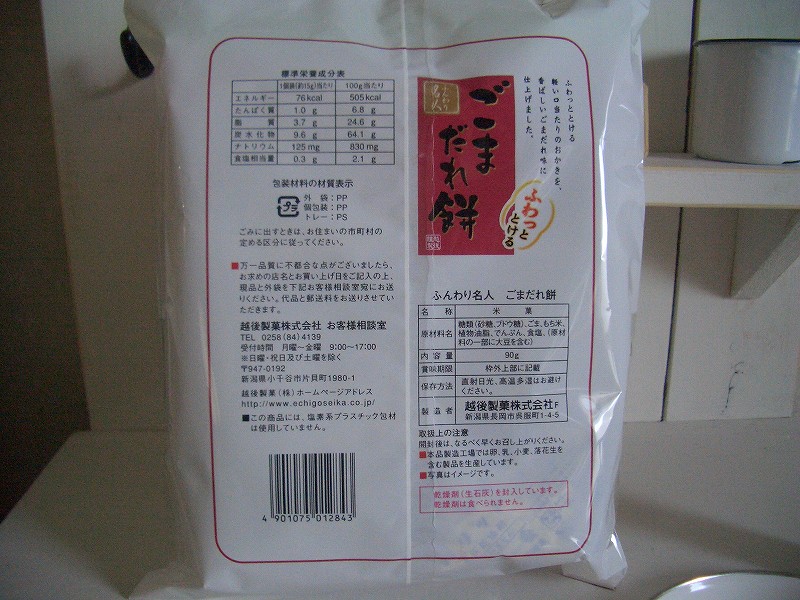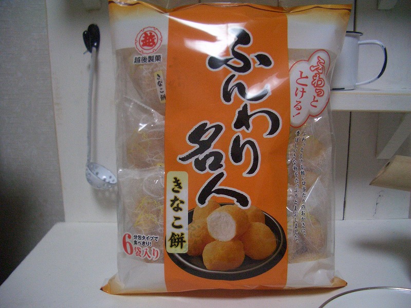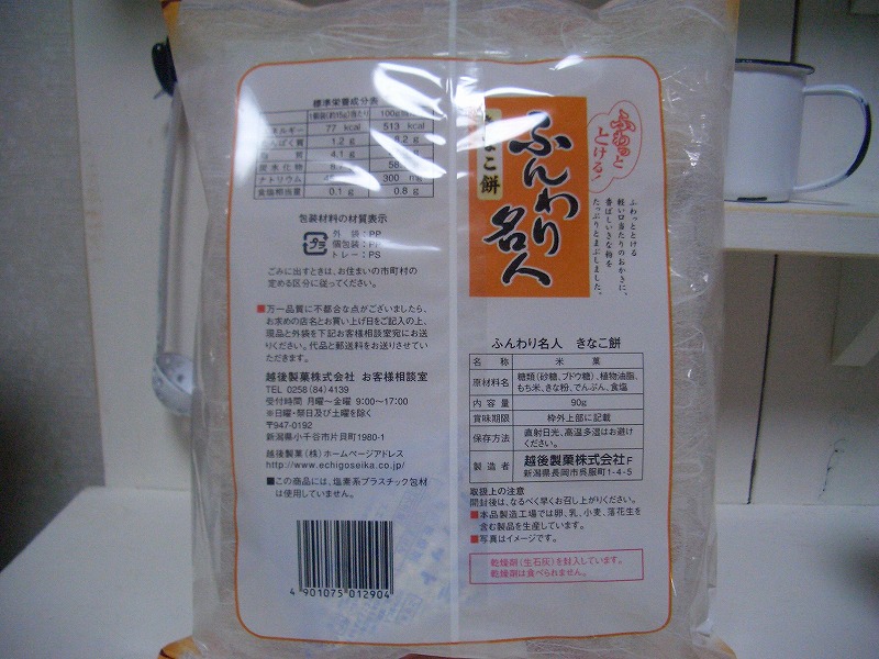 で、インターネットで色々調べてみると越後製菓さんのホームーページに『TVチャンピオン菓子通選手権チャンピオンが2005年のスナック菓子MVPに「ふんわり名人きなこ餅」を選んでくれました。』という記事がありました。2年前くらいからあるお菓子だったんですね。