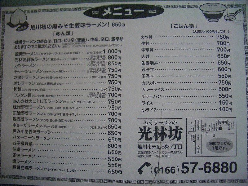 今日の旅は、昼食を家で食べたので、夕食に行った光林坊(住所:旭川市末広5条7丁目、TEL:0166-57-6880)です。