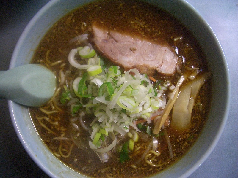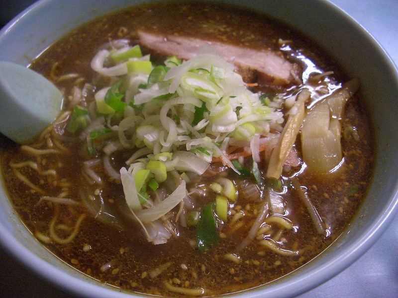 FOODAD「旭川発の黒味噌生姜味ラーメンらしいです。なるほど、見た目は醤油ラーメンのように黒いスープです。そこで、実際スープを一口すすってみると、味噌ラーメンです。スープ自体は甘めのスープですが、後味がぴりっと辛いです。生姜の味はあまり感じられません。好きな感じのスープです。ねぎだくです。もやしは、湯通しをしているのかくたっとなっていました。DAD的には、もう少し歯ごたえのあるしゃっきとした感じが好きです。チャーシューは歯ごたえがあるチャーシューで噛めば噛むほど旨みがでるという感じです。麺も標準的な旭川麺でした。」