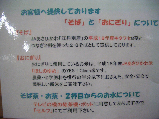 FOODAD「そばは、江丹別産そば粉を使用した2・8そばです。こしがあり、普通においしいです。おにぎりは、閉店間際に行ったせいか、ご飯が乾いて硬くなっているようでした。」