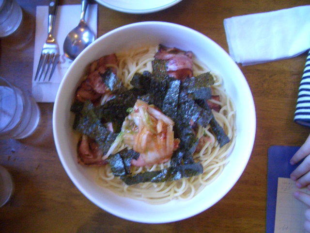 FOODMAM「これが、私の定番メニューよ。他のメニューも食べたいけど、1年に1度くらいしか来れないので、やっぱり定番メニューね。パスタにキムチと思うかもしれないけど、このタラコソースには、キムチがとてもぴったりよ。大葉が入っているのもポイントが高いわね。」