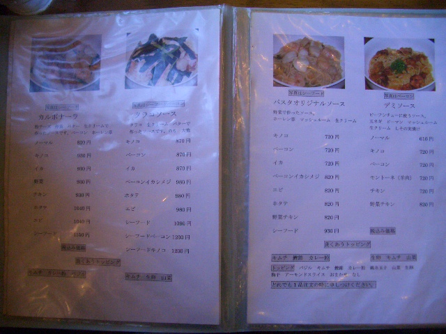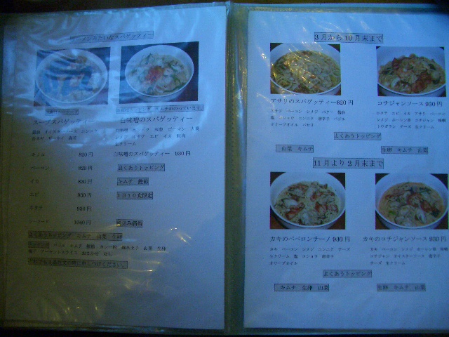 今日の旅は、帯広最後の昼食と言うことでパスタ(住所:帯広市西三条北1-16-3、TEL:0155-23-7755)です。イタリアンではなく、スパゲッティー屋さんです。いつも、混んでいて、今日も12時前に行きましたが、ほとんど満員状態でカウンターしか開いていなかったのですが、ご夫婦二人できているお客さんにテーブル席をゆずっていただきました。ありがとうござました。ありそうでない感じでとても好きなお店です。