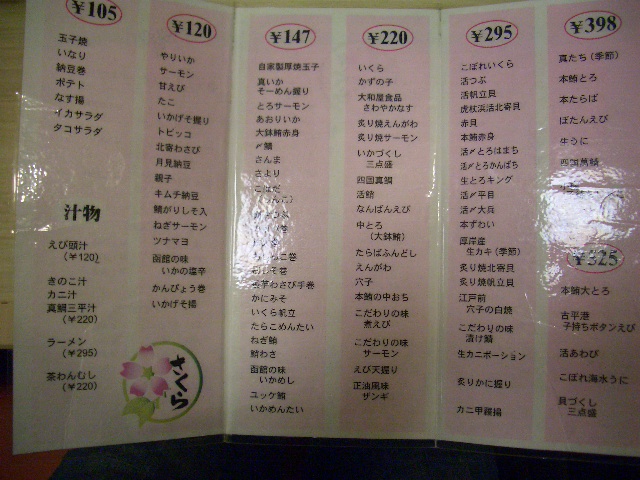 今日の旅は、廻転すしさくら(住所:帯広市西20条南4丁目39-12、TEL:0155-35-4222)です。昼食が遅かったため、回転寿司にしました。結局、おなかがいっぱいであまり食べれませんでした。
